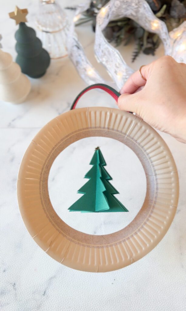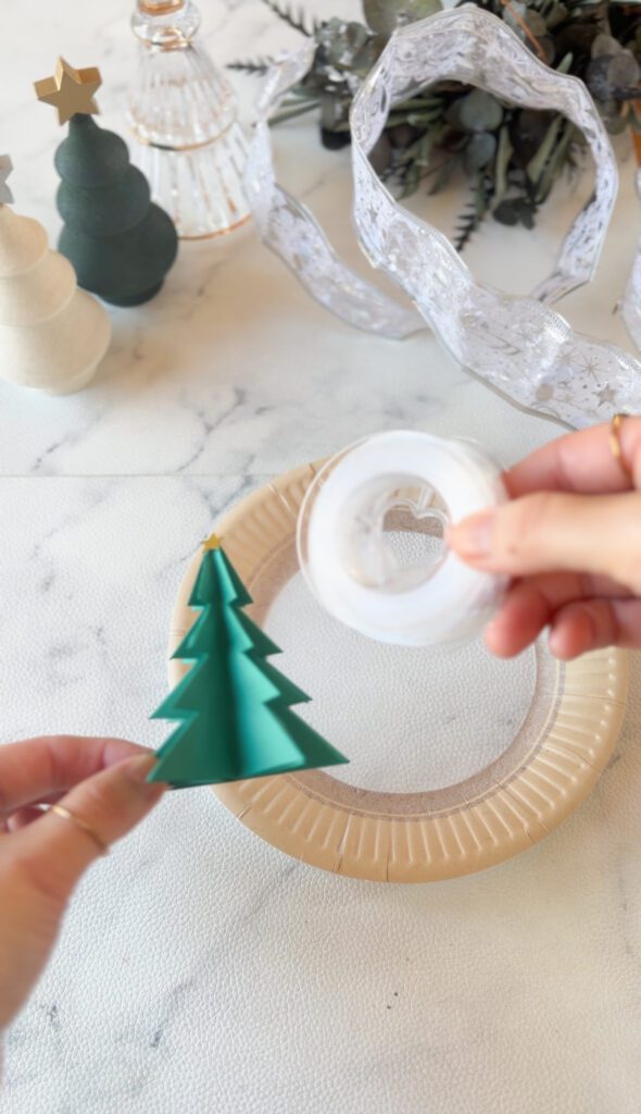 - 紙皿の裏側で、てぐすをテープでしっかり固定します(ツリーの向きが正面にくるように)