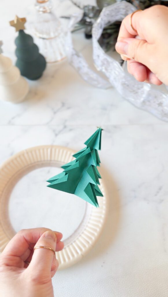 完成したツリーは後でリースに吊るすので、少し厚めの折り紙で作ると丈夫です。