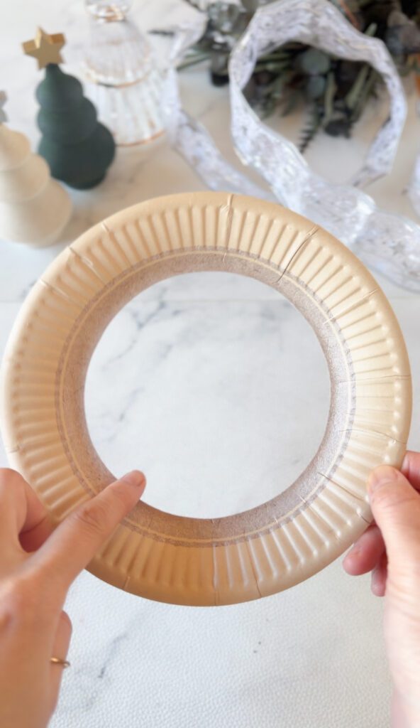 紙皿の真ん中をハサミで丸くくり抜いて、リースの土台を作りましょう。