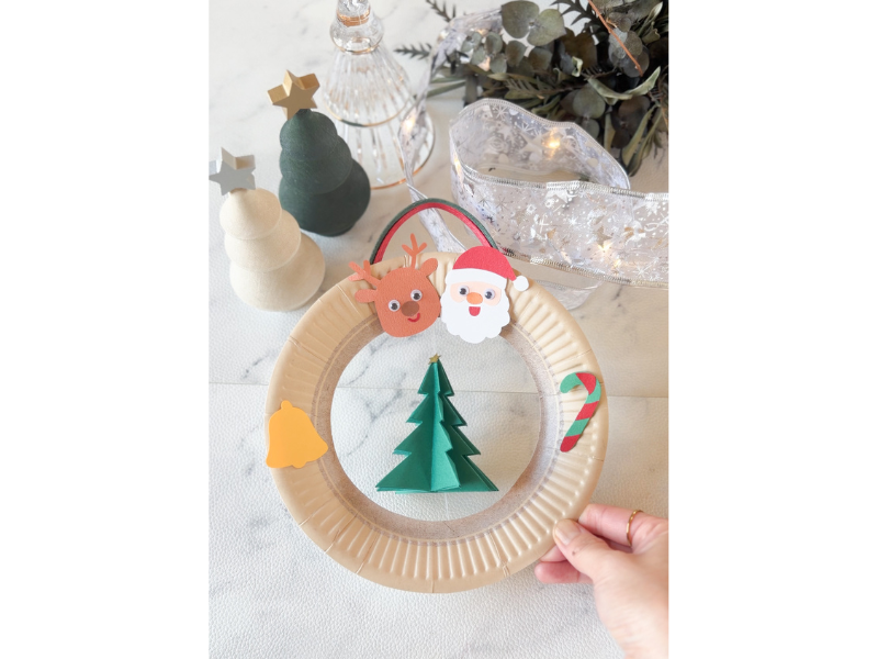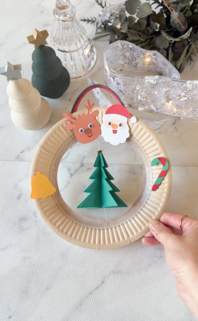 紙皿でアレンジして「クリスマスリース」にしてみました。